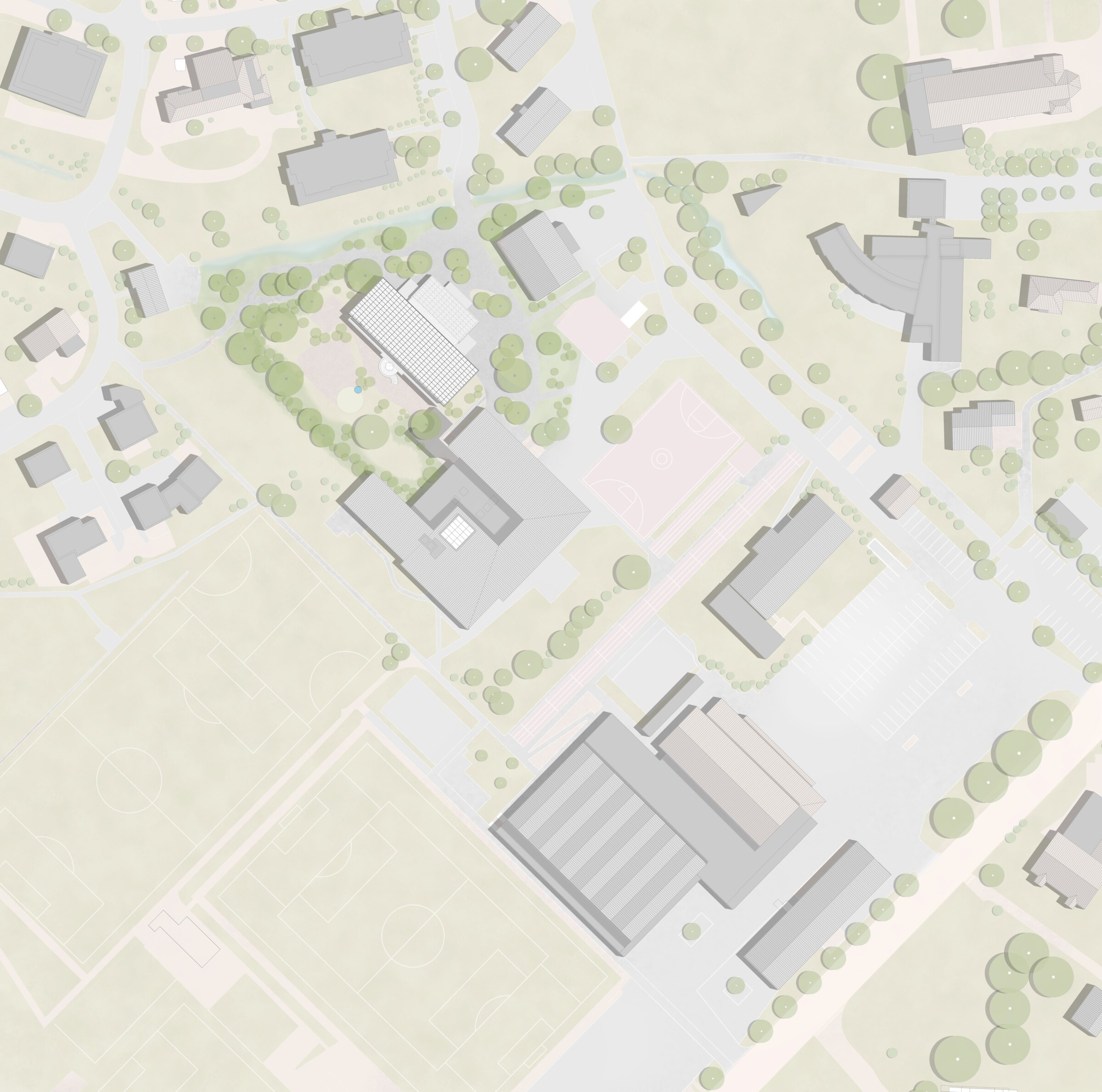 Der entworfene 6-fach-Kindergarten in Eschenbach fügt sich feinfühlig in das Schulensemble ein und nutzt die Freilegung des Bachs als identitätsstiftende Schwelle. Drei Eingänge und ein offenes Treppenhaus strukturieren die Ankunft für die Kinder, schaffen Orientierung und verbinden die Gruppen spielerisch. Flexible Raumcluster mit Gruppenräumen, Garderoben und Nischen ermöglichen individuelle pädagogische Nutzung. Jede Gruppe hat eigene Aussenspielflächen, während der gemeinsame Garten vielfältige Spiel- und Lernangebote bietet.